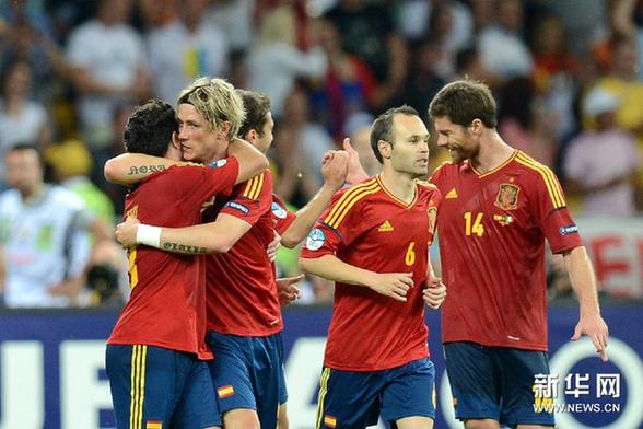 7月1日,在烏克蘭基輔奧林匹克體育場進(jìn)行的2012歐洲足球錦標(biāo)賽決賽中,西班牙隊以4比0戰(zhàn)勝意大利隊,奪得冠軍
