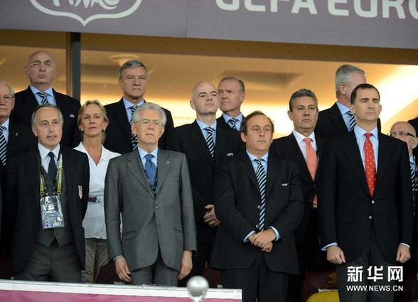 新華社照片,基輔,2012年7月2日 (歐錦賽)(8)足球——西班牙奪得歐錦賽冠軍 7月1日,西班牙王儲費利佩(前排右一)、歐足聯(lián)主席普拉蒂尼(前排右二)、意大利總理蒙蒂(前排左二)等出席決賽。當(dāng)日,在烏克蘭基輔奧林匹克體育場進(jìn)行的2012歐洲足球錦標(biāo)賽決賽中,西班牙隊以4比0戰(zhàn)勝意大利隊,奪得冠軍。