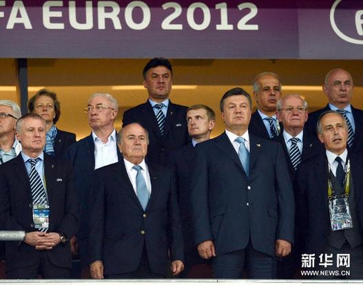 新華社照片,基輔,2012年7月2日 (歐錦賽)(9)足球——西班牙奪得歐錦賽冠軍 7月1日,國際足聯(lián)主席布拉特(前排左二)、烏克蘭總統(tǒng)亞努科維奇(前排右二)等出席決賽。當(dāng)日,在烏克蘭基輔奧林匹克體育場進(jìn)行的2012歐洲足球錦標(biāo)賽決賽中,西班牙隊以4比0戰(zhàn)勝意大利隊,奪得冠軍。