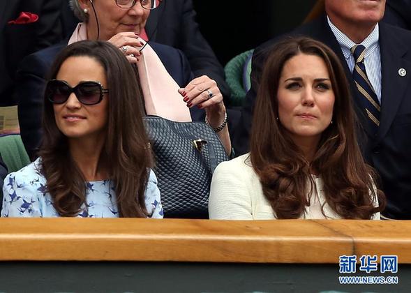 7月8日,英國凱特王妃(右)和妹妹皮帕·米德爾頓在看臺上觀看比賽。當日,在2012年溫布爾登網球公開賽男單決賽中,瑞士選手費德勒對陣英國選手默里。