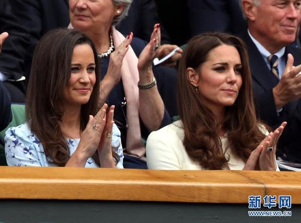 7月8日,英國凱特王妃(右)和妹妹皮帕·米德爾頓在看臺上觀看比賽。當日,在2012年溫布爾登網球公開賽男單決賽中,瑞士選手費德勒對陣英國選手默里。