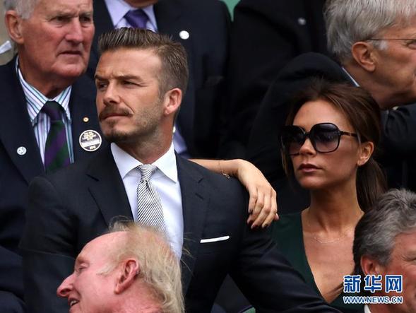 7月8日,貝克漢姆夫婦在看臺上觀看比賽。當日,在2012年溫布爾登網球公開賽男單決賽中,瑞士選手費德勒對陣英國選手默里。
