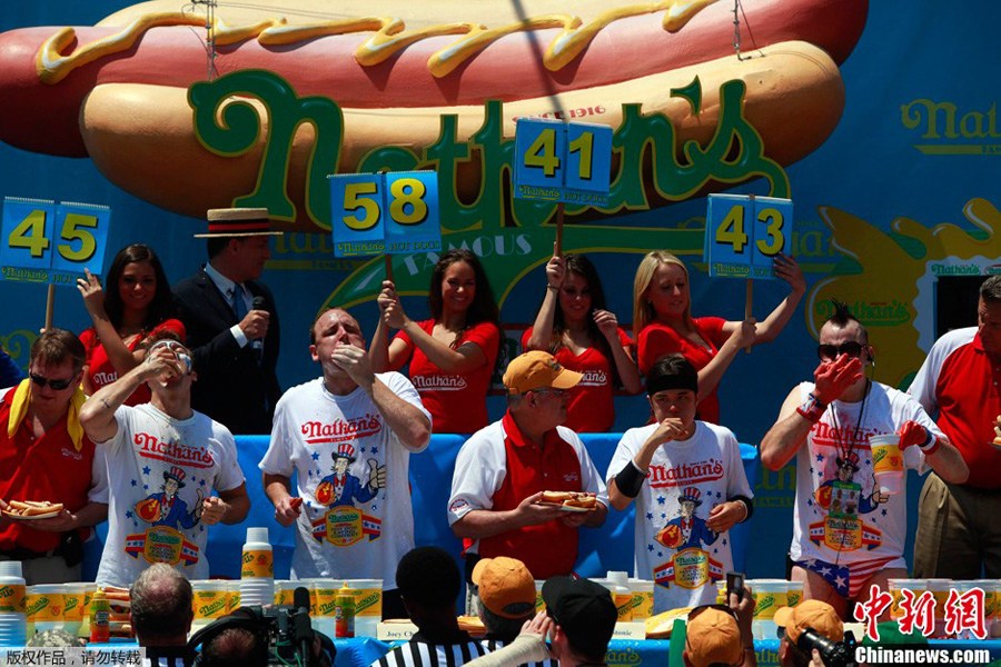 當地時間7月4日,紐約康尼島,一年一度的吃熱狗大賽激烈上演,在十分鐘內,來自加州圣何塞的切斯納吞下了68個熱狗,打破了上一屆他自己創下的62個熱狗的記錄,連續六年獲得男子冠軍。另外,托馬斯在10分鐘內吞下45個熱狗,打破上屆自己創下的40個熱狗的記錄,贏得女子組冠軍。