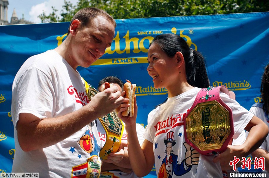 當地時間7月4日,紐約康尼島,一年一度的吃熱狗大賽激烈上演,男子冠軍切斯納和女子冠軍托馬斯在賽前稱重。