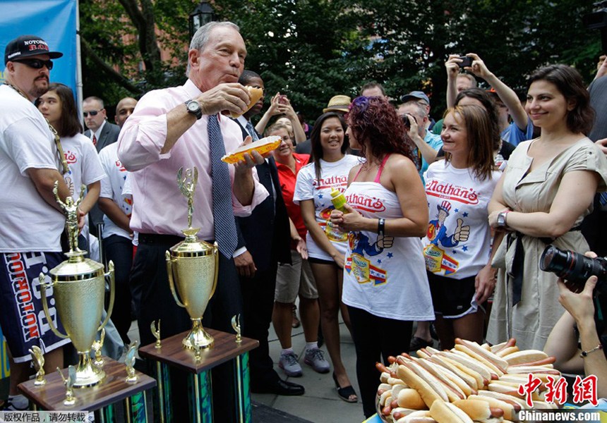 當地時間7月3日,美國紐約,在內森國際熱狗速食大賽稱重儀式上,紐約市市長邁克爾·布隆伯格在吃熱狗。一年一度的熱狗速食大賽將于4日在布魯克林的康尼島區舉行,有望吸引3萬名愛好者。