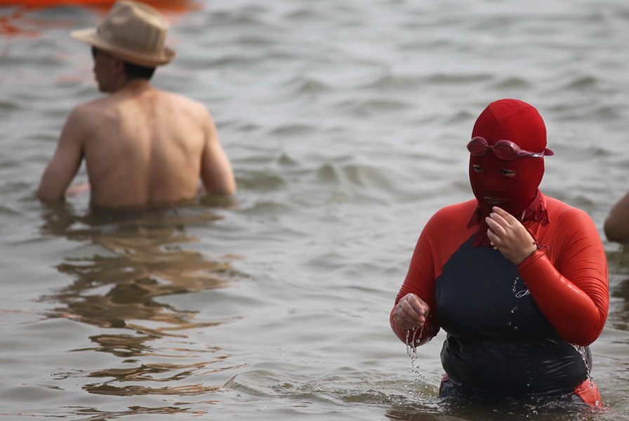 7月6日,山東青島第一海水浴場,女士們戴著尼龍面罩在海水浴場游泳。