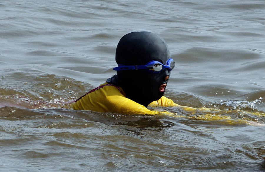 7月6日,山東青島第一海水浴場,女士們戴著尼龍面罩在海水浴場游泳。據悉,這種面罩發明于七年前,作用是保護面部免受陽光直射的有害影響。