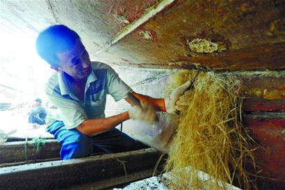 觀察眼前這艘已經(jīng)初步成型的木質(zhì)小船,記者不禁疑問,這樣的木船是否能夠經(jīng)受住大海的考驗。而對此老船工們倒是很有自信,“這艘船做好了,跑個20年以上沒有問題。”老工匠之一的韓成德老人自信地說道。而老工匠們自信的源泉就在于木船選料的考究,一條木船絕不是只用一種木材就能制成,從骨架到船皮,一條船至少需要5種以上的木材。木船的骨架選料最為關(guān)鍵,必須使用結(jié)實的硬雜