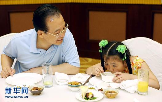 7月13日至15日,中共中央政治局常委、國務院總理溫家寶到四川省成都市就當前經濟形勢進行調研,并在成都主持召開河南、湖南、廣西、四川、陜西五省區經濟形勢座談會。 7月14日晚,溫家寶總理專門將王佳淇、趙其松、段志秀、郎錚、劉小樺、宋馨懿等6名汶川地震災區學生請到住地,和他們一起用晚餐,并給他們每人寫了一段寄語,勉勵他們自信自強、努力奮斗,愿他們愉快、健康、進步。這是溫家寶和宋馨懿在一起。