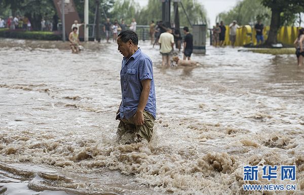 7月24日,行人在漫過(guò)路面的江水中行走。
