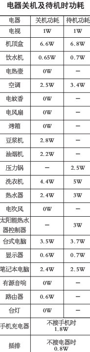 記者進行實驗的這戶居民家,基本從不拔下電源線的電器有電視、洗衣機、熱水器、飲水機、機頂盒、油煙機、臺式電腦、有源音箱、路由器、顯示器、筆記本電腦、4個插排、2個手機充電器,經過測算,這些電器的總功率約為0.034KW ,一個月下來電器待機產生的電費約為14元。在未更換新電表前,每兩個月的電費基本在80元至100元之間,在今年年初更換新式電表后,電費增多至120元到140元之間,在電器并沒有增多的情況下,增多的電費基本上是新式電表測量到的電器待機耗電。由于實驗測試中讀取的是短時功率,無法與真實生活中的實際情況完全相符,因此除去這部分誤差,待機耗電的電費基本上是電費總額的三分之一。