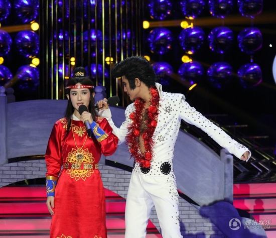 而賈玲的反串,也是當晚最大的搞笑點。賈玲不僅“變聲”阿寶,在造型上也下足功夫,謝娜形容賈玲“只穿了一件坎夾就上來了”,帶著標志性的頭巾,粘著胡子的賈玲,演出十分賣力,高音也演繹得很漂亮,令王祖藍都心動,欲做賈玲的男朋友,引得現場笑翻天。
