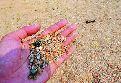 昨天,記者來到了第一海水浴場。靠近馬路一側的沙灘遠看是黃白色的沙子,走近一看卻是如綠豆大小的石子,還摻雜了一些海蠣子皮,腳踩在上面有一種麻酥酥的感覺。繼續往大海的方向走去,取而代之的是沙子和石子混合在一起的“沙灘”,走起來硌腳的感覺會輕一些。在較為濕潤的靠近海的地方,地上的沙灘都是一些白色、半透明的石子細沙。調查發現,一浴東西兩側的沙質有所不同,浴場的東側沙灘沙質比較細膩,西側沙灘則較粗。