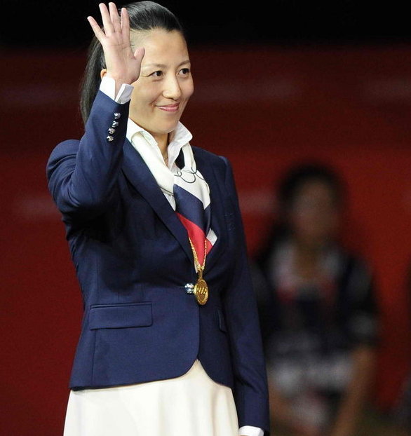 2012年8月1日,倫敦奧運會,乒球女單內戰,李曉霞力克丁寧奪冠。圖為大楊揚為獲獎選手頒獎。