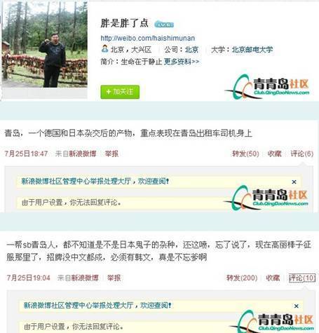 7月30日,北京某男微博開罵,因打車侮辱青島人。此人在微博上發了數篇微博侮辱青島人,并且因承受不住壓力將回復權限關閉掉,因打車的事情你用這么惡毒的語言侮辱全體青島人,以侮辱青島人的方式發泄不滿你覺得合適嗎?有投訴電話你可以通過投訴