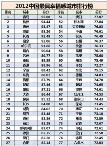 日前,由中國城市競爭力研究會、香港浸會大學當代中國研究所主辦的“2012中國城市分類優勢排行榜”新聞發布會在香港浸會大學舉行。會議公布以上消息。其中“2012中國最具幸福感城市”前三名分別是青島、杭州和惠州。