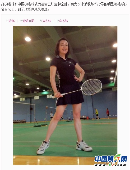 劉曉慶打羽毛球慶祝林丹奪冠 球拍打到自己險毀容