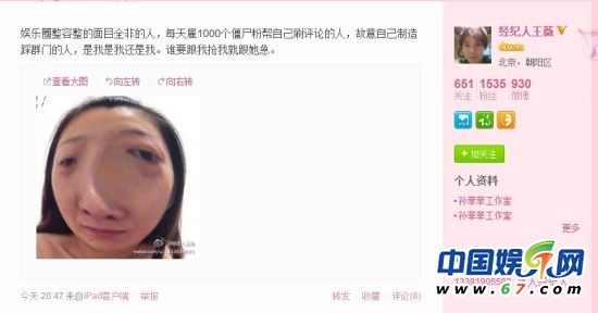 今晚,孫菲菲的前經(jīng)紀(jì)人王薇在微博中意有所指地說(shuō)道:“娛樂(lè)圈整容整的面目全非的人,每天雇1000個(gè)僵尸粉幫自己刷評(píng)論的人,故意自己制造踩裙門(mén)的人,是我是我還是我。誰(shuí)要跟我搶我就跟她急。”隨后,她又在微博中表示自己受到了孫菲菲的威脅,“今天有人威脅我,讓我等著瞧。我好怕怕啊。今天留微博為證。如果我將來(lái)發(fā)生什么意外,