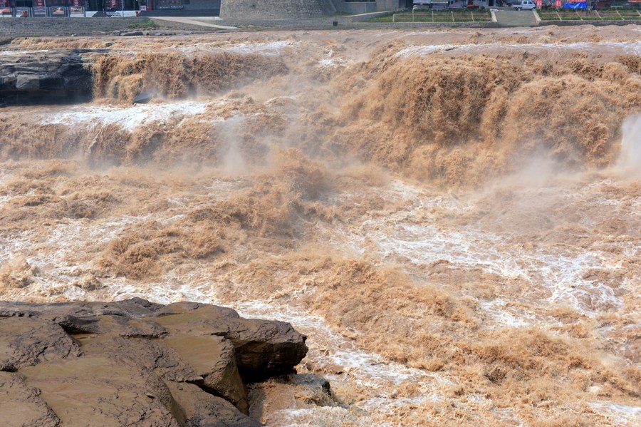 8月29日,黃河壺口瀑布景區主副瀑布連成一片,形成特大瀑布群。由于受上游降雨增多,黃河晉陜峽谷上游開閘泄洪,雖然汛期已過,但水位再次上漲,水流量增加到每秒4000多立方米,是去年同期的一倍左右,壺口瀑布形成長達300多米的特大瀑布群。