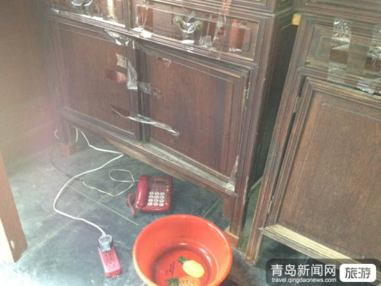 ????記者隨后來(lái)到徐福殿,雖然大殿的大門(mén)敞開(kāi)著,但內(nèi)殿里卻沒(méi)有任何工作人員,只在兩側(cè)隨意支著一張辦公桌和椅子。而當(dāng)記者進(jìn)入到徐福殿后殿的明清家居陳列館時(shí),看到的景象更為震驚。進(jìn)門(mén)之后,首先映入眼簾的是一條插排隨意的放在潮濕的地上,并且插著手機(jī)充電器,而在插排的旁邊則四處放著臉盆和電話等雜物,儼然一個(gè)雜物間。