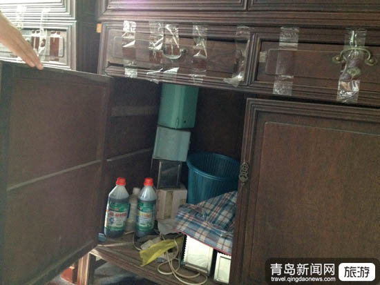 ????而房間里所陳列的家具更是破敗不堪,落滿了灰塵。柜子上得抽屜和櫥門(mén)全都貼著透明膠,底下的柜子虛掩,記者打開(kāi)一看里面給更是擺放了各式各樣的雜物,原本供游客參觀的景點(diǎn)變成了工作人員存放雜物的儲(chǔ)物間。