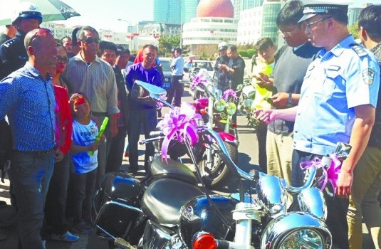 ????指揮中心立即調派附近執勤的市南交警香港西路中隊民警往前盤查。當這一車隊行駛至澳門路短暫停留時,數輛警車一齊抵達澳門路,將6輛摩托車全部包圍。這6輛摩托車都是哈雷、寶馬等豪華摩托車,每輛的價值都在20萬元以上,有的車型甚至近30萬元。為了不影響婚車進度,將違法摩托車查獲后,民警將婚車檢查后放行。