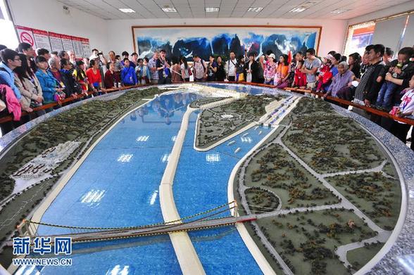 10月2日,游客在三峽大壩景區內觀看三峽工程模型。今年“超長黃金周”期間,正值三峽水庫175米汛后試驗性蓄水,游客為一睹高水位下的三峽景觀紛至沓來。據三峽旅游總公司相關負責人介紹,10月1日國慶節當日,景區共接待游客2.4萬人次,創下2011年以來的最高值,預計2日游客將達到3萬人次;長假前3天,游客總數將創下三峽大壩景區開放以來的歷史新高。新華社發(鄭家裕攝)