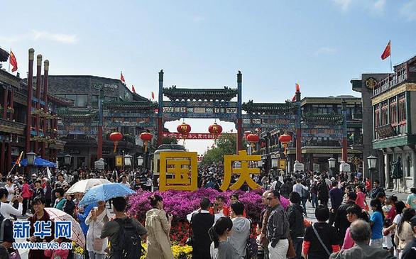 10月3日,眾多游客在前門大街游覽、觀光。當日是中秋國慶長假的第四天,前門大街、故宮博物院等北京熱門旅游景點迎來眾多游客。新華社發(賀燦鈴攝)