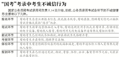 該負責人表示,從2008年開始,國家公務員局對中央機關和地方公務員招考中的違紀違規和不誠信行為信息進行匯總,建立了“公務員錄用考試違紀違規與誠信檔案庫”。