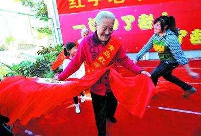 ????上午10時許,記者在紅宇老年公寓看到,上百名老人坐在一起看節(jié)目,自編自演的節(jié)目讓老人們樂得前仰后合。“下面由我們老年公寓年齡最大的3位老大姐上臺,給我們表演膠州大秧歌。”70多歲的報幕人話音剛落,98歲的張文芳老太太和其他兩名九旬老太隨即登臺,她們腰間扎著紅綢子,隨著音樂美滋滋地扭動起來。