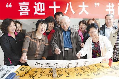 ????■昨天,市北區鎮江路街道組織了“喜迎黨的十八大”書畫作品展,共展出由社區書畫愛好者創作的書畫作品200余幅。(記者 王群 攝)