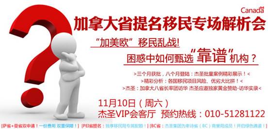 對(duì)于2013年加拿大PEI省提名計(jì)劃政策的變化,杰圣集團(tuán)近期將舉辦兩場(chǎng)有關(guān)加拿大省提名專場(chǎng)講座會(huì),為當(dāng)前投資移民申請(qǐng)人所面臨的困惑解疑,為申請(qǐng)人選擇出最為適合的省提名項(xiàng)目。杰圣北京因私出入境中介機(jī)構(gòu)協(xié)會(huì)會(huì)長(zhǎng)、杰圣總裁齊立新先生將親臨講解,敬請(qǐng)關(guān)注!
