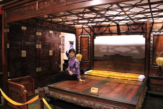 穿著民國服飾的女講解員在展示一套珍貴的紅木床