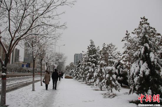 11月9日晚呼和浩特突降大雪,10日清晨街頭樹木銀裝素裹,全都披上人天賜的衣裳!圖為路人行走在童話世界里。任晏黎 攝