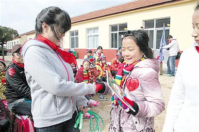 在上甲小學(xué)的教室前,志愿者們親手給學(xué)校選出來(lái)的40名家庭貧困兒童戴上了圍巾和手套,并把書包和學(xué)習(xí)用具送給每個(gè)孩子。