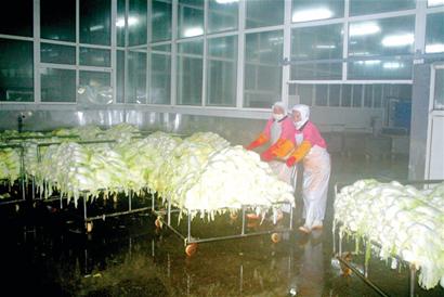 記者看到,泡菜加工車間被分隔成五部分,對(duì)應(yīng)的是加工的五大環(huán)節(jié)。許勤海介紹說,毛菜采購回來后,首先需要進(jìn)行剝皮、清洗和分割切塊,然后經(jīng)過第一道撒鹽腌漬程序,時(shí)間控制在10個(gè)小時(shí)。初次腌漬結(jié)束后,進(jìn)行清洗并消毒,再經(jīng)過幾個(gè)小時(shí)控水處理后,將事先調(diào)配好的醬料均勻涂抹在白菜上。調(diào)制好的泡菜經(jīng)過冷庫打冷處理,出廠時(shí)加上外包裝,一袋成品泡菜就完成了。