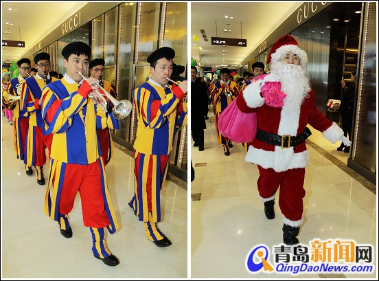 圣誕老人帶領盛裝的“夢幻卡通糖人”隊伍巡游青島海信廣場