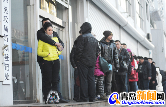 ??? 今天早上記者在四方婚姻登記處看到,還不到7時30分,登記處門口就排起了一條等待登記結婚的長龍,據了解,當天共有123對預約登記的新人領到結婚證,另有100多對新人現場領證。(記者張力偉)