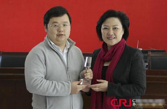 一家媒體的主持人向向十八大代表、南京西花村社區黨支部書記石磊贈送水晶話筒。