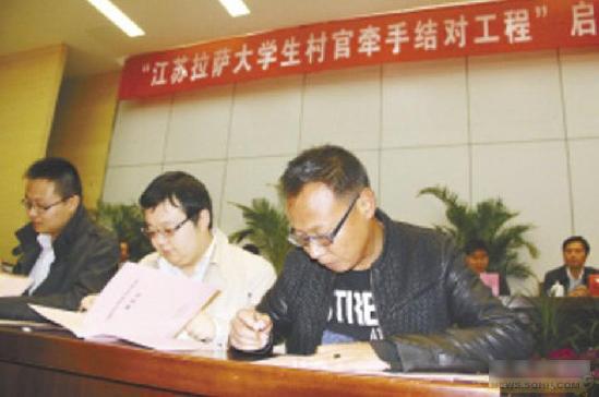 石磊與西藏大學生村官扎西平措(右)簽訂簽收結對協議書。