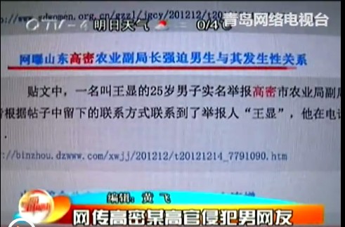 ????最近,一位名叫“飛在心上T”的網友,在大眾論壇發表了一條名為“實名舉報高密市農業局副局長,誘騙男生強迫發生性關系”的帖子。貼子中,一個名叫王顯的25歲男子,實名舉報高密市農業局副局長聶玉杰,多次誘騙他并強迫與他發生性關系多達5次,同時還威脅他,不許走漏風聲,否則就把他的照片在網上曝光。帖文中敘述說,今年7月份,高密市農業局副局長聶玉杰加了王顯的qq號,之后倆人以普通朋友的身份在網上聊天,十分投機,而聶玉杰更是讓從小沒有父親的王顯,感受到了父親般的溫暖。兩人在網上聊了五個月后,今年的10月17號,聶玉杰提出見面,兩人約在了濰坊田思瑞國際大酒店,并開了房間,之后強迫王顯和他發生性關系。