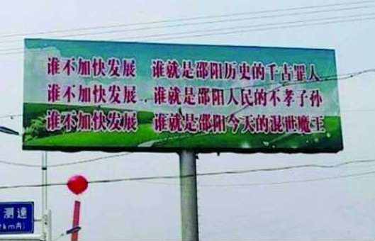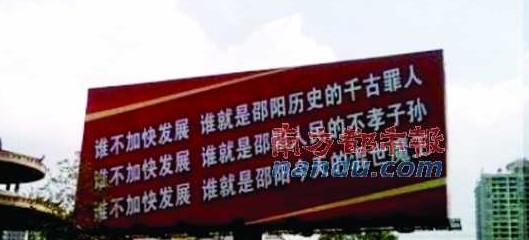 ????一塊“湖南邵陽市霸氣廣告牌”昨日引來網友關注,該標語牌稱:“誰不加快發展,誰就是邵陽歷史的千古罪人!誰不加快發展,誰就是邵陽人民的不孝子孫!誰不加快發展,誰就是邵陽今天的混世魔王!”南都記者查證,上述內容于今年5月3日,邵陽市委書記在中共邵陽市委十屆三次全體(擴大)會議開幕式的講話中就曾提到過。