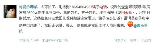 ????無獨有偶,12月16日,記者接到網友“綠小魚”投訴,稱有人打電話讓去領補貼,并稱:“今天是最后一天,逾期不予辦理?!薄熬G小魚”覺得好笑:“16日是星期日,市南財政局根本不上班?!辈贿^她同樣不解,騙子在電話里準確說出了寶寶姓名、家庭住址等信息,他們是如何知道這些的?