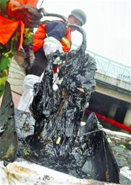 ????“我們是市政公司的,已經在這干了接近10天了。我們共設置了7個清理點,每天都有近百人進行清理。清理上的污油,都運到附近的一家熱電廠進行焚燒處理了?!爆F場一名指揮打撈的負責人告訴記者,這些污油的異味太大了,他們經常被熏得頭暈腦脹。