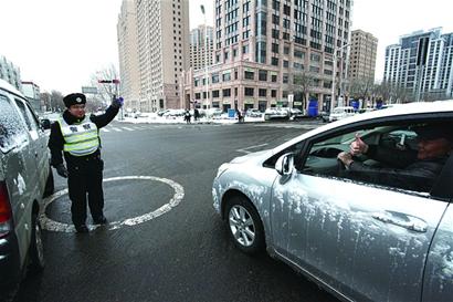 薛海濤臉被風吹得紅紅的,不時地還抹著鼻子。“這兩天感冒了,今天按正常情況應該休息的,可是下大雪又被調來上崗了。”薛海濤說,好多同事和他一樣,都是為了島城道路的交通安全暢通。