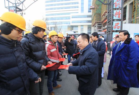 ????今天上午,青島市總工會主席李皓一行,分別來到中啟膠建集團青島婦女兒童醫療保健中心(二期)項目工地、城陽區白沙灣保障性住房工地,慰問正在工作的農民工,并發放了10萬元的慰問金和慰問品,用于救助困難農民工、購置春節工地留守人員生活慰問品和書籍、文化體育用品。在兩個工地現場,李皓主席一行向困難農民工發放了救助金及350套保暖內衣的同時,向他們送去了節日的祝福。
