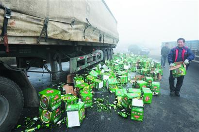 ????目擊者劉女士介紹,當時她開車恰好經過此處,在拐彎時突然看到前面的貨車“噼里啪啦”地滾落下成箱的啤酒。包括她的車在內,貨車后邊跟著的兩輛轎車都來了個急剎車,才躲過一劫。“沒有超載,第一次出這種事。”司機告訴記者,他是物流公司的,從機場方向運貨去市區,沒想到途中帆布扣開了。