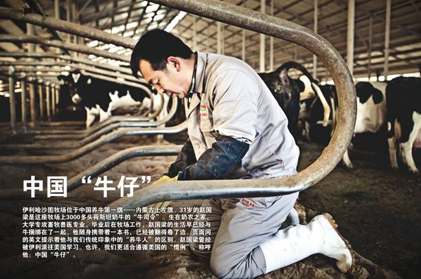 ????近日,來自騰訊網(wǎng)《中國(guó)人的一天》專題圖片站的一組講述中國(guó)“牛仔”一天的照片引起了廣大網(wǎng)友的熱議。而該組照片的主人公正是來自伊利哈沙圖牧場(chǎng)的場(chǎng)長(zhǎng),3000多頭荷斯坦奶牛的“牛司令”趙國(guó)梁。 ????他是一名80后小伙,出生在奶農(nóng)之家,從小就與奶牛結(jié)下了不解之緣。高考后,他報(bào)考了內(nèi)蒙古農(nóng)業(yè)大學(xué)動(dòng)物醫(yī)學(xué)專業(yè),而如今加入伊利集團(tuán)也4年有余,并成為了伊利哈沙圖牧場(chǎng)的一場(chǎng)之主。不僅如此,2011年,趙國(guó)梁還被選派到美國(guó)學(xué)習(xí),曾受教于美國(guó)乳業(yè)泰斗桑德斯教授。那一年的美國(guó)進(jìn)修之旅,趙國(guó)梁為中國(guó)的奶牛養(yǎng)殖業(yè)帶回來了新理念,即“舒服的牛才能產(chǎn)好奶”。
