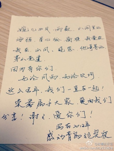 獲獎之夜,孫東生寫下給自己親密網友的話:“因為有你們,無論風雨,無論坎坷,這么多年,我們一直在一起!榮譽屬于大家,愛由我們分享!謝謝!愛你們!”他把這段文字分享給多年來活躍在公益活動前沿的弟兄姊妹們。——@星心狐oO心似蓮花開 @天之藍也 @傳說中的薇姐 @嶗山風 @蒲桓_ @青島茅山老道 @青島一葫蘆_綻放 @婉兒如風 @yaa_yaaa @劉璐_Rachel