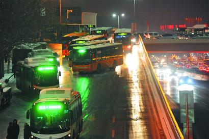 “大學路一直到登州路,南向北的公交車都停擺了,我們現在都開始步行回家了。 ”昨晚8時許,市民尹女士致電本報讀者熱線。記者隨后趕到現場,發現包括307路、25路等在內的公交車,沿著大學路、文登路,從海洋大學附近路段一直排到了膠寧高架路大連路路口,足有60多輛。記者在膠寧高架路大連路路口看到,十余輛公交車在冰面橫七豎八停著,兩起追尾事故堵癱馬路。楊海濤